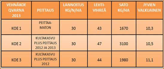 Kuvan kasvustoille (2013) on annettu lannoitetyppeä vain 30 kg hehtaarille. Kuvan rajan vasemmalla puolella on peittaamaton kasvusto, jonka siemeniä ei ole peitattu 2012 Kultakasvu Plussalla (koe 1). Rajan oikealla puolella kasvaa Qvarnaa, jonka siemenet on otettu viljaerästä, joka kasvoi kesällä 2012 Kultakasvu Plus-tuotteella peitatuista siemenistä - mutta 2013 nämäkin siemenet ovat kylvetty peittaamattomina (koe 3). Oikeanpuoleinen kasvusto on yleisilmeeltään jonkin verran tummemman vihreää ja tasaisemmin kasvanutta. Kuva antaa viitteitä siitä, että kesällä 2012 Kultakasvu Plus-peittauksen seurauksena syntynyt siemenien aktivoituminen näkyy vielä vuoden 2013 kasvustossa. Tätä havaintoa tukee myös koealueilta puidut sadot, joka on esitetty alla taulukossa 1.