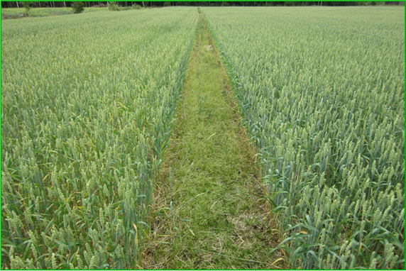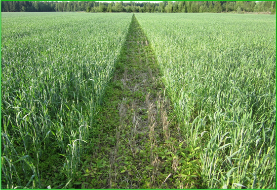 Yleiskuva koealueelta kesäkuussa 2013. Viljelykokeen lohkon ominaisuudet olivat melko haasteelliset vehnälle. Heti kyntösyvyyden alapuolella maaperä on hyvin hapanta pH:n ollessa luokkaa 3. Kasvukautena kokonaissademäärä oli vain 45 mm. |