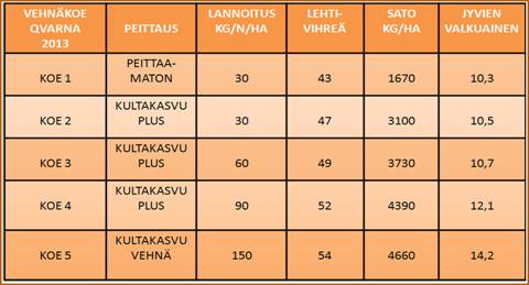 Kahtena keväänä tehty Kultakasvu Plus peittaus (taulukossa 2 merkitty kokeeksi 2) lisäsi 30 kg/N/ha typpilannoituksella satoa 1430 kg/ha peittaamattomaan kokeeseen 1 verrattuna. Kun Kultakasvu Plus-peittauksien yhteydessä lannoitetyppeä lisättiin määrästä 30 kg/ha määrään 60 kg/ha, sato kasvoi 630 kg/ha (kokeet 2 ja 3). Lisättäessä Plus-peittauksen yhteydessä lannoitetyppeä määrästä 60 kg/ha määrään 90 kg/ha (kokeet 3 ja 4) sato lisääntyi 660 kg/ha. Lisättäessä lannoitetyppeä määrästä 90 kg/ha määrään 150 kg/ha (eli 60 kg/ha typpimäärän lisäys) sato lisääntyi vain 270 kg/ha, kun 150 kg/N/ha typen määrällä vertailuna oli Kultakasvu Vehnä-tuotteella peitatun kasvuston antama sato (kokeet 4 ja 5).