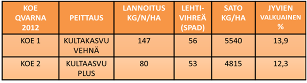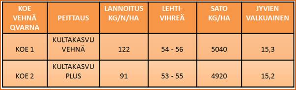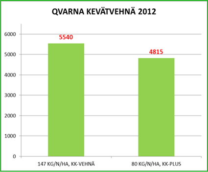 Viljelykokeen tulokset on esitetty yhteenvetona yllä olevassa taulukossa. Kun lannoitetyppeä on annettu Qvarnalle 147 kg/ha, kasvustolla on ollut käytettävissään kasvuunsa melko runsaasti lannoitetyppeä. Kun lannoitetyppeä on vähennetty 67 kg/ha määrään 80 kg/ha, Kultakasvu Plus tuote on tehostanut kasvuston käytettävissä olevan typen hyödyntämistä jolloin satoeroksi on supistunut 725 kg/ha. ”Yhteenveto kokeista” -sivun taulukon 2 perusteella jo 40 kg/ha lisätypen odotetaan lisäävän vehnällä satoa 600 - 800 kg/ha. |